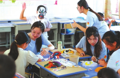 “这些脸谱背后藏着哪些英雄故事呀?”暑期,广西桂林市兴安县高尚镇中心小学的一间教室里,孩子们握着画笔,专注地描画关羽的丹凤眼、包公的月牙,笔尖跳跃着朱砂红,手中的脸谱熠熠生辉,仿佛历史人物正对新时代的小传人微笑。一旁,江苏省盐城师范学院支教大学生赵文秀脸上也露出了欣慰的笑容。