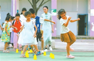 室外,连续3年赴桂支教的盐城师范学院大学生黎晓文正带着孩子们开展心理团辅活动。在“翻山越岭接力赛”和“我是小小演说家”游戏中,学生们跨越障碍物到达终点后,分享了自己的梦想。