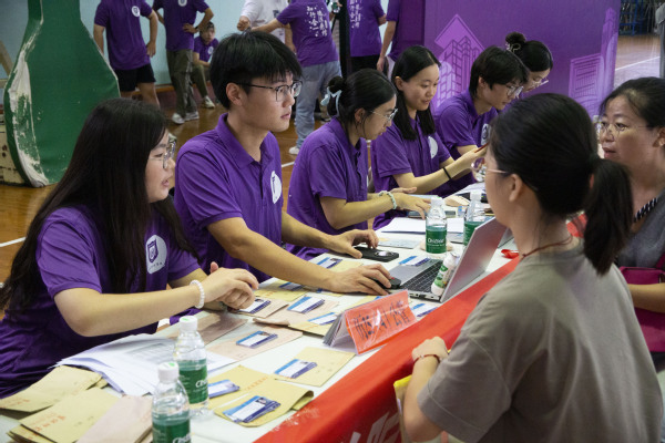 迎新现场,志愿者穿梭其间,忙碌而有序,仔细核对新生的录取通知书与身份证、收取发放各类新生材料,保障报到流程高效顺畅。耐心引导新生办理入住手续,细致解答关于校园生活的各类疑问,用周到服务为初来乍到的新生拂去陌生感。此外,学院还为每位新生精心准备专属紫色院服,成为新生与学院温暖连接的第一份纪念。