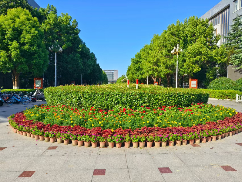 从厚德楼门口,到学海大道路口;从图书馆门前,到胜利河边小提琴雕塑周围,再到通榆校区的陈毅元帅塑像下,一盆盆、一簇簇鲜艳的草花竞相绽放。环境服务中心的园艺师将一串红、万寿菊、节节高、彩叶草、长春花等花卉约9000盆进行艺术化组合,每一处细节都承载着学校对新生的美好祝愿、对祖国的深厚情感。
