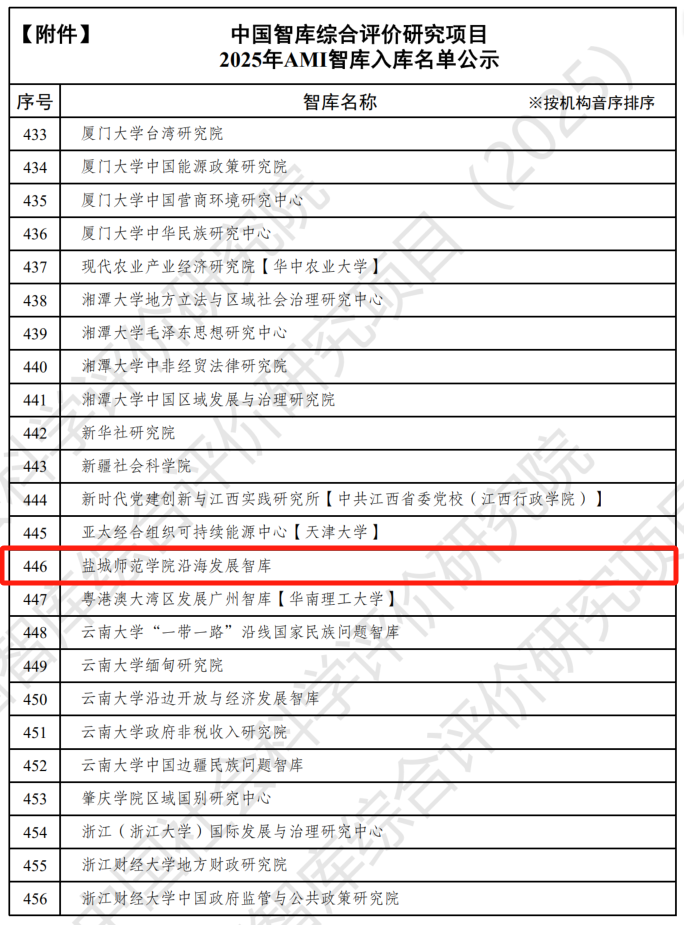 近日,中国社会科学评价研究院正式公布中国智库综合评价研究项目(2025)评审结果,盐城师范学院沿海发展智库凭借扎实的积累和鲜明的特色,成功入选“2025年AMI智库入库单位”。这标志着我校智库建设迈上新台阶,综合实力获国家级权威认可。