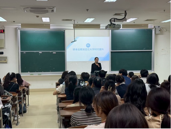 随后,朱老师以“赢在大学,赢在未来”为主题展开讲座。她结合转本新生的学习与发展特点,深入剖析大学阶段在职业生涯规划中的关键意义。结合当前社会需求与教育行业发展趋势,分析研究生阶段学习对于提升个人竞争力和拓展职业路径的重要价值,帮助同学们深刻认识到社会需求的多样性与明晰自我定位的重要性。