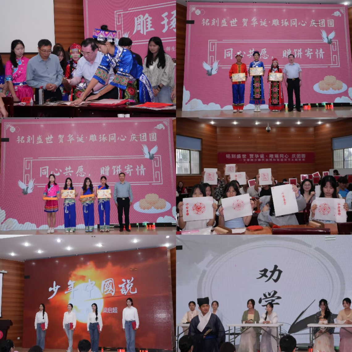活动中,朗诵《少年中国说》生动诠释当代青年学子心系家国、报效祖国的凌云志向与赤诚热忱,国色今人汉服社的《劝学》将中华传统服饰的华美与古典文学的深厚底蕴展现得淋漓尽致,充分展现学子积极向上的精神风貌。在非遗体验环节中,盐都区雕版印刷非遗项目负责人戚九龙现场演示雕版印刷技艺,师生亲手创作融合双节元素的雕版印刷作品,不仅让民族学生在亲手操作中直观感受传统技艺的独特魅力,更在潜移默化中增进对中华优秀传统文化的认同感、自豪感和归属感,促进了各民族文化的交流互鉴。