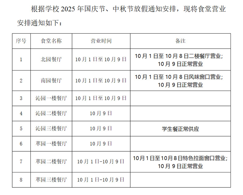 关于2025年国庆节、中秋节假期食堂营业安排的通知
