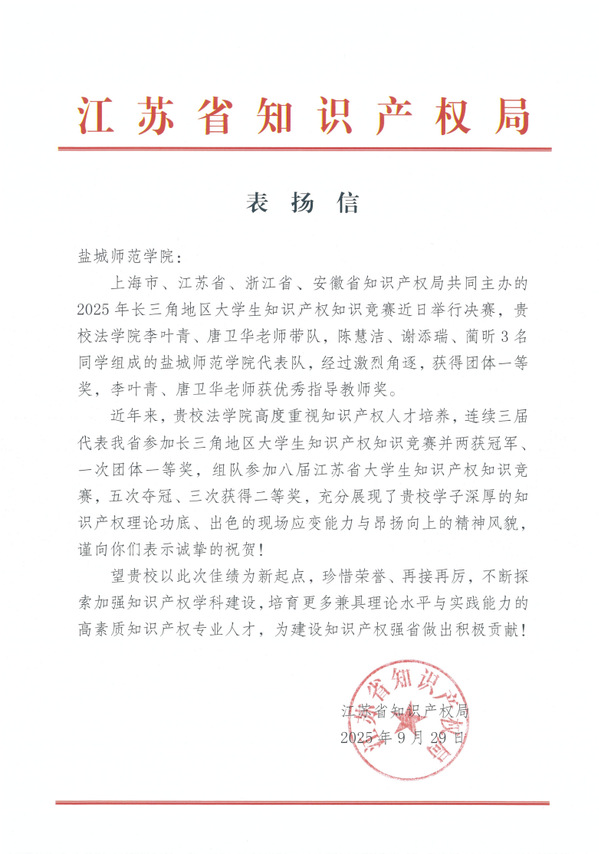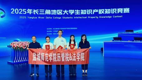 近日,2025年长三角地区大学生知识产权知识竞赛决赛在江苏电视台教育频道演播厅举行并同步现场直播,由历史与公共管理学院(法学院)李叶青老师、唐卫华老师担任领队,法学23级陈慧洁、蔺昕、谢添瑞等同学组成的我校代表队斩获团体一等奖。为此,江苏省知识产权局向我校发来表扬信,对我校表现予以高度肯定与诚挚祝贺。