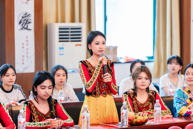 来自苗族的学生代表龙红翠结合自己在学校两年的学习生活,分享在盐师大家庭中感受到的温暖。辅导员则从“家国情怀与青年责任”“求同存异”等角度与同学们深入交流,希望大家将个人成长与国家发展、民族进步紧密结合起来,肩负起维护民族团结、促进国家发展的责任与使命。