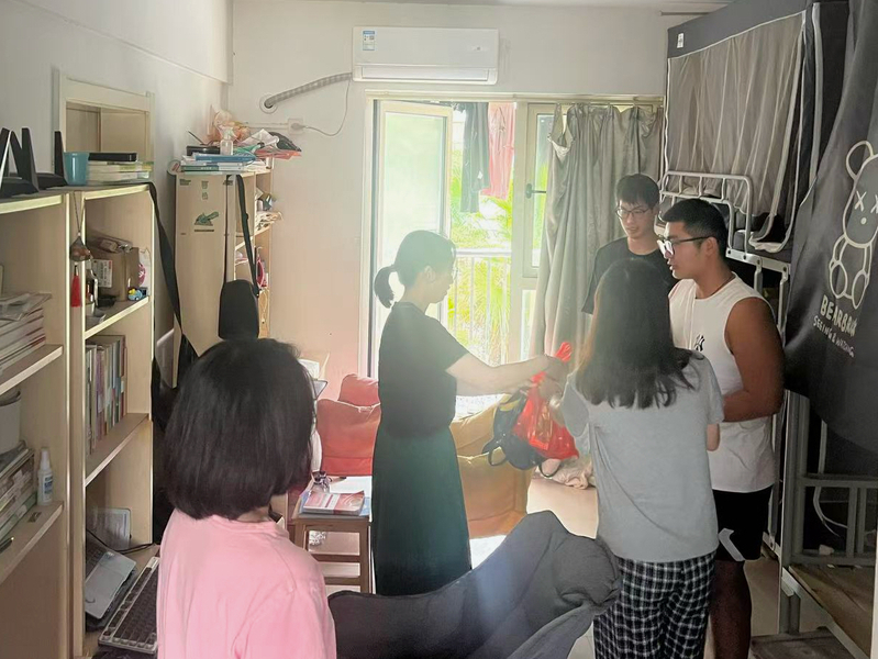 在学生宿舍,老师们细致地了解同学们的学习与生活状况,并送上精心准备的月饼等慰问品,叮嘱大家要注重健康管理,做到合理作息、均衡饮食、适度运动,度过一个既健康又祥和的中秋假期。此外,学院同步推出“中秋氛围合影”和“AI绘中秋海报”两项线上主题活动,鼓励同学们用镜头记录下身边的团圆美景,用现代科技创意表达对健康生活的理解。