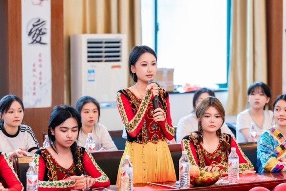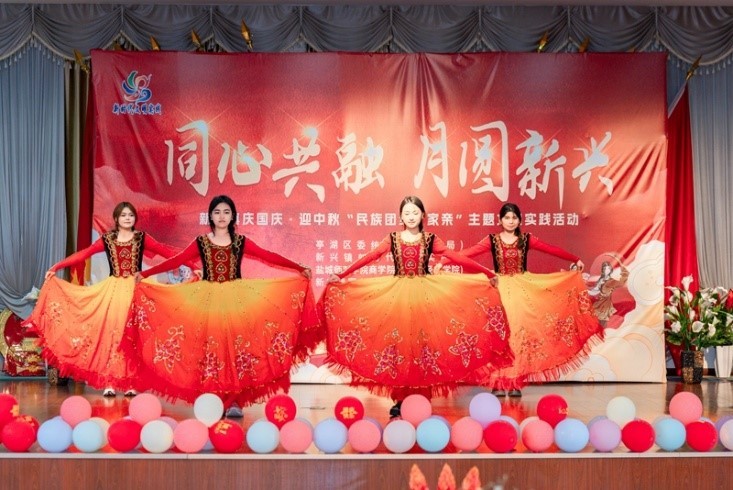 为庆祝中华人民共和国成立76周年,喜迎中秋佳节,9月28日下午,江苏省盐城市亭湖区新兴镇“庆国庆·迎中秋——民族团结一家亲”主题文明实践活动在同心村新时代文明实践站圆满举行。活动由亭湖区委统战部(民宗局)、盐城师范学院商学院(数字经济学院)与新兴镇联合主办。来自回族、维吾尔族、柯尔克孜族、苗族、哈尼族等多个民族的群众代表及师生代表约60人欢聚一堂,共叙深厚情谊,共绘民族团结美好画卷。