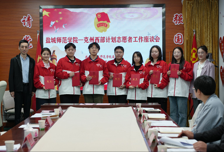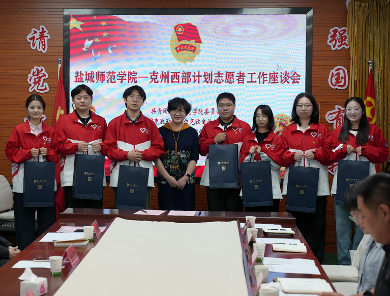 会议现场,双方共同为“盐城师范学院大学生社会实践基地”签约并揭牌。与会领导向西部计划志愿者发放满载着母校关怀与期望的慰问品,并为他们颁发“西部计划联络员”聘书。