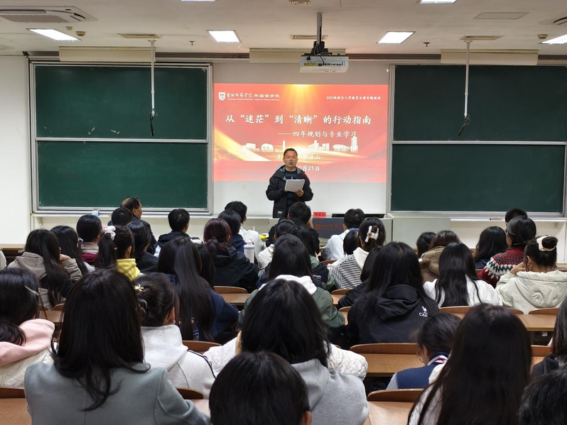 10月21日晚,外国语学院特邀学院离退休教师袁益山为2025级英语师范专业全体新生带来主题为《从“迷茫”到“清晰”的行动指南》的生涯教育讲座,学院党委副书记宋传盛主持活动。
