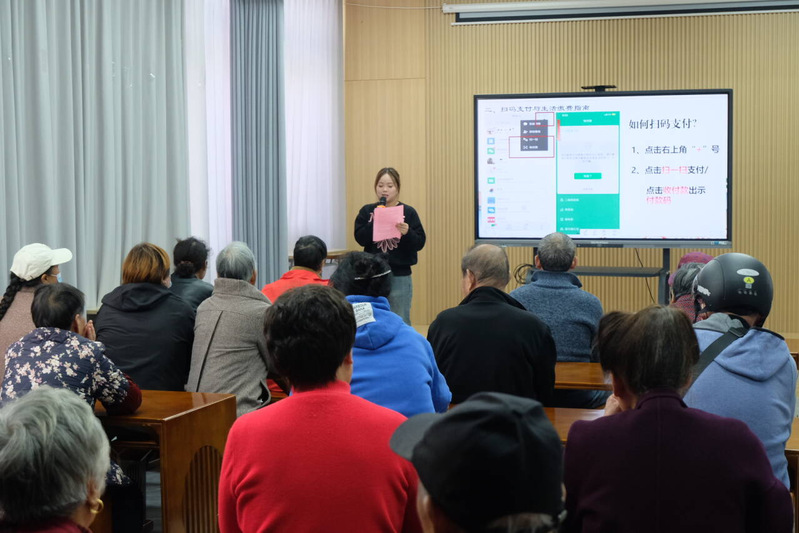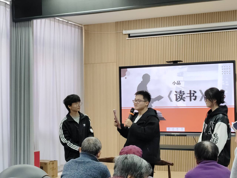 活动中,主持人详细介绍“科技助老+文化传情活动的核心主题与目的。在数字科普讲座中,志愿者以大屏演示结合一对一辅导,聚焦老年人高频生活需求,系统讲解智能手机实用功能,帮助老年人提升生活技能。志愿者还提醒居民警惕代办养老金”“保健品虚假宣传”“高息投资等常见骗局,帮助老年人守好钱袋子”。在文艺汇演环节,志愿者以生动有趣的小品展现老年人生活场景,既增添了活动的趣味性与感染力,也通过文艺表演传递孝亲敬老情感,现场氛围温馨热烈。