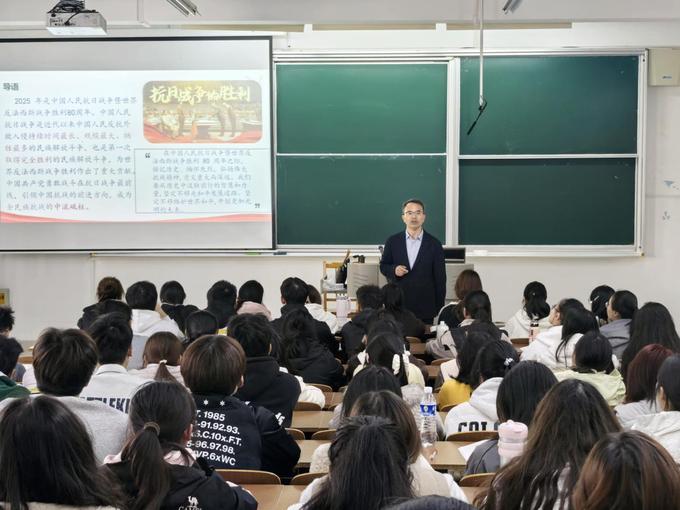11月10日下午,学校党委副书记于建江在新长校区公共教学楼A106教室为商学院部分学生讲授题为“弘扬伟大抗战精神 砥砺奋进新征程——纪念中国人民抗日战争暨世界反法西斯战争胜利80周年”的形势与政策课。