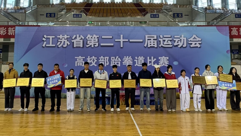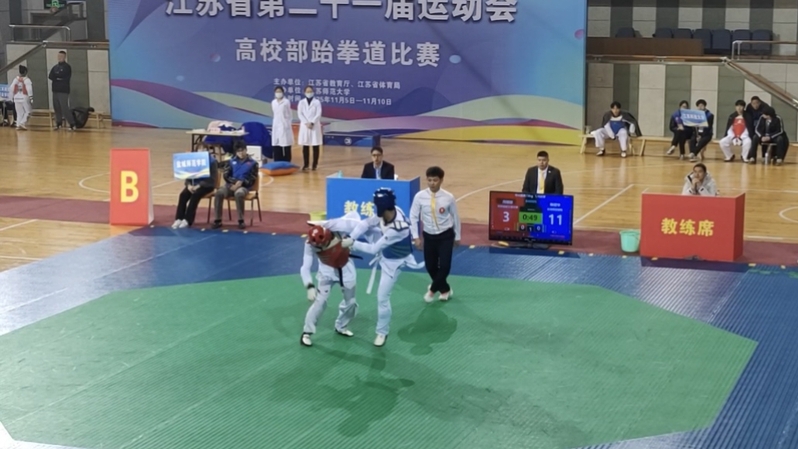 11月5日—10日,由江苏省教育厅、江苏省体育局举办的江苏省第二十一届运动会高校部跆拳道比赛在徐州举行。在教练员方炜老师的指导下,我校体育与健康学院代表队陶向汲同学夺得男子+80kg级别铜牌,史伟兴同学获得男子54kg级别比赛第五名、陈冠华同学获得男子72kg级别第五名、储颖同学获得女子+72kg级别第五名,我校荣获本次大赛的体育道德风尚奖。