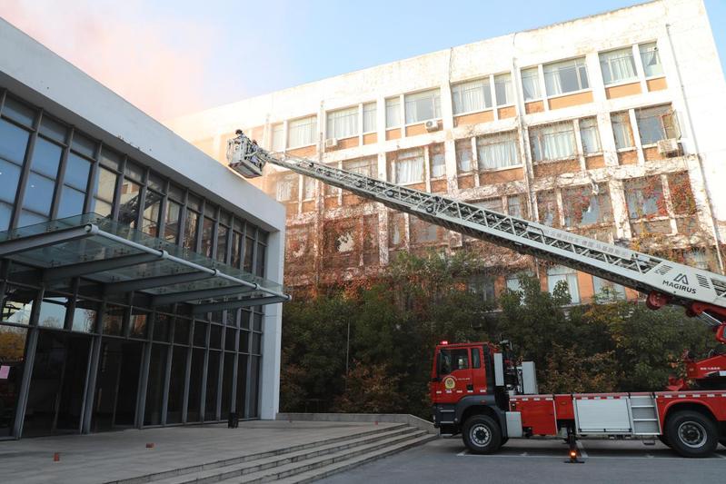 本次演练分为观看教育视频、消防知识讲解、疏散逃生演练、高空云梯救援、师生实战灭火五项内容。现场讲解灭火器的类型、适用场景及规范操作步骤等消防知识;随后师生现场演练用毛巾捂住口鼻、弯腰低姿有序疏散逃生,消防员使用云梯高空营救被困师生的应急技能。现场气氛热烈,师生积极参与。师生还分组进行实战灭火练习,亲自操作干粉灭火器扑灭火源,进一步巩固所学技能,提升在真实场景中的心理素质与应对能力。