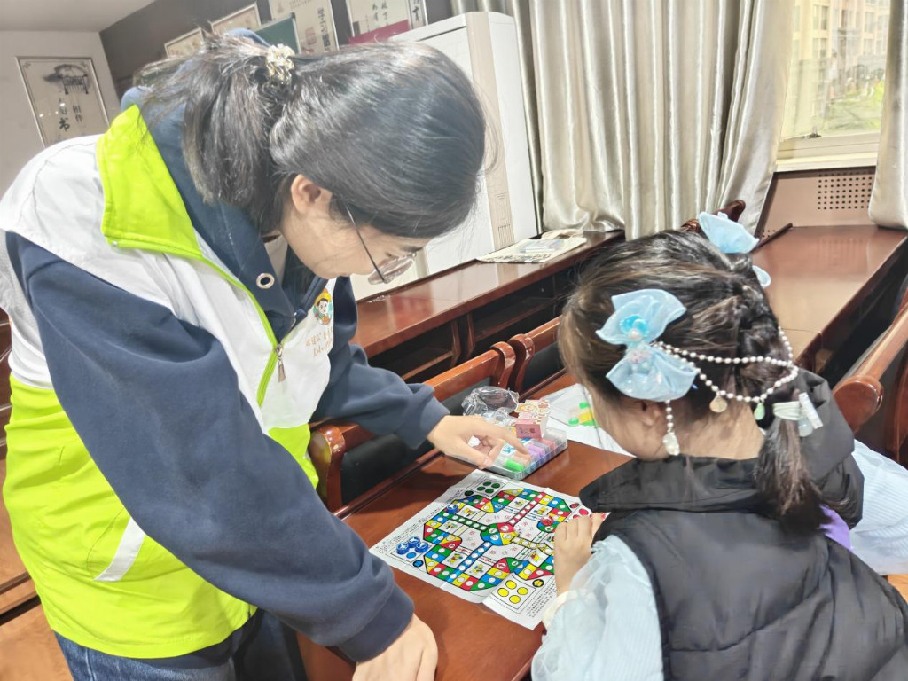 盐城师范学院商学院的志愿者们化身“暖心大朋友”,与孩子们开展多样互动。在绘画课堂上,志愿者耐心指导孩子用画笔勾勒缤纷世界;在益智游戏区,志愿者和孩子一起在飞行棋的“闯关”里欢笑,在围棋对弈中锻炼思维。这些一对一的陪伴,不仅为孩子带来了欢乐,更在潜移默化中传递着关爱与温暖。