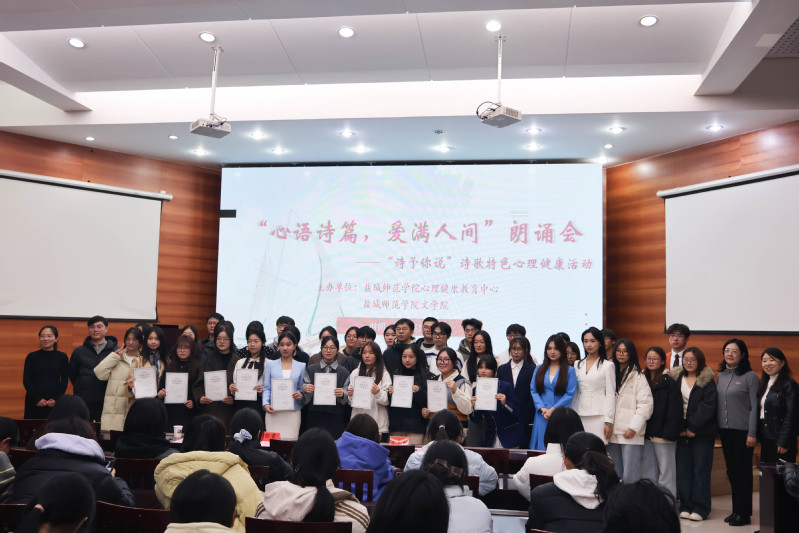 活动在文学院话剧社心理情景剧《不器之诗》中拉开序幕,该剧展现了当代大学生面对AI,从困扰到和解的成长轨迹。外国语学院《当我真正开始爱自己》,历史与公共管理学院(法学院)《心灵的晴空,由我点亮》《做最好的自己》等朗诵让大家在自我激励中不断成长。物理与电子工程学院《心光映岸,爱韵和鸣》,人工智能学院《大地上的我们》等朗诵让大家与世界共振,感受心与爱的温柔契合;马克思主义学院《生命》,文学院《候鸟的掌纹》等朗诵给大家直面困难的勇气。从“接纳自我”到“关爱他人”,从“直面迷茫”到“坚定未来”,同学们多角度诠释了“12·5·要爱我”的丰富内涵,展现了盐师学子积极向上的精神风貌。徐晓娟为参演学生颁发证书,并合影留念。