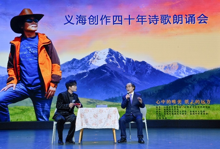 “一路歌唱,一路芬芳”。为回顾著名双语诗人、诗评家、翻译家义海四十多年的创作实绩,一场以“心中的唯美,纸上的远方”为题旨的“义海创作四十年”诗歌朗诵会,12月14日下午在盐城市文化群星剧场隆重举行。省内外朗诵名家齐聚一堂,朗诵了义海四十多年的代表性作品近三十首。著名表演艺术家、上海电影译制厂知名演员丁建华专程赶赴盐城朗诵。盐城师范学院党委书记张玉勤出席朗诵会。应邀出席本次朗诵的还有,江苏省作家协会副主席、著名儿童文学作家祁智,盐城师范学院原党委常委、原副校长庞波,盐城师范学院党委常委、宣传部部长冯永玲,盐城市文化馆馆长杨莺,江苏雅家乐集团有限公司董事长蒋刚,以及盐城师范学院相关职能部门和二级学院的领导以及文学院师生代表。