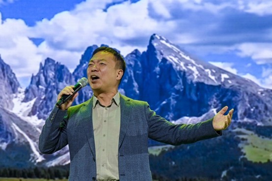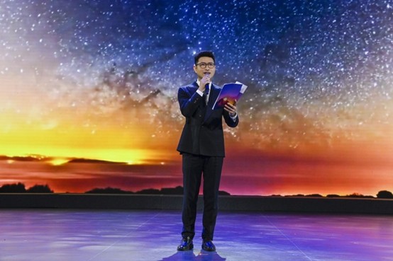 著名表演艺术家丁建华这是第二次参加义海的诗歌朗诵会。2015年她曾参加义海创作三十年诗歌朗诵会。丁建华这次朗诵了义海的作品《金鱼的墓碑》,并与义海合作朗诵了《西茉纳之歌·流浪》。丁建华在朗诵艺术上精益求精的艺术精神,深深感染了在场的每一位听众。朗诵结束后,丁建华说:“朗诵,是让文字获得第二次生命的过程。今天,当我再一次站在盐城的舞台上,用声音走进义海老师的诗歌世界,依然能感受到那份纯粹的艺术震颤。从《西茉纳之歌·流浪》的流动与诗意,到《金色的墓碑》的庄重与深刻,每个字都承载着情感的力度,美学上的纯粹。声音的艺术,是分寸,是理解,更是对创作者最深的致敬。感谢诗歌,感谢这片土地,让我们在同一个时空,共同抵达远方。”