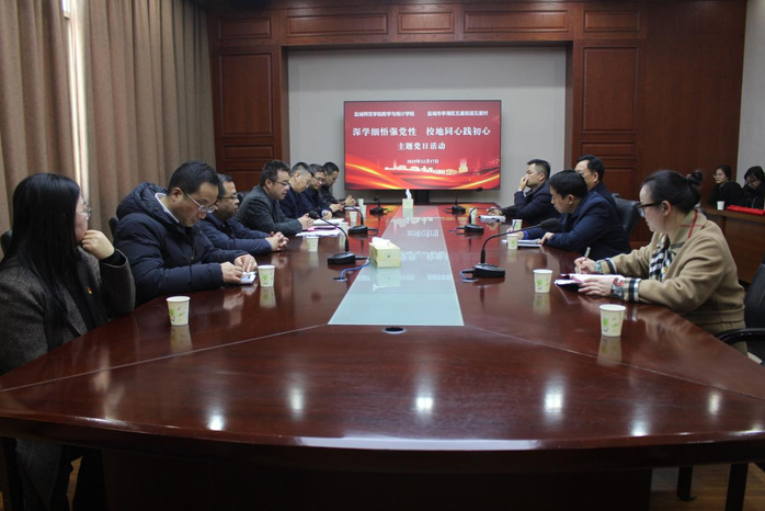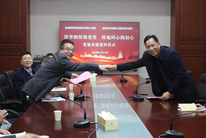 1217日,数学与统计学院与盐城市亭湖区五星街道五星村在五星村党群服务中心联合开展深学细悟强党性 校地同心践初心党建共建活动。学院全体党员教师、五星村党员代表齐聚一堂,以党建引领+数据赋能为双引擎,共绘校地协同发展新图景。