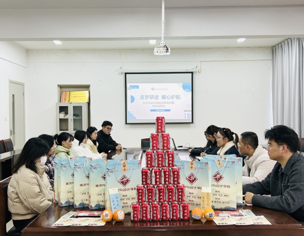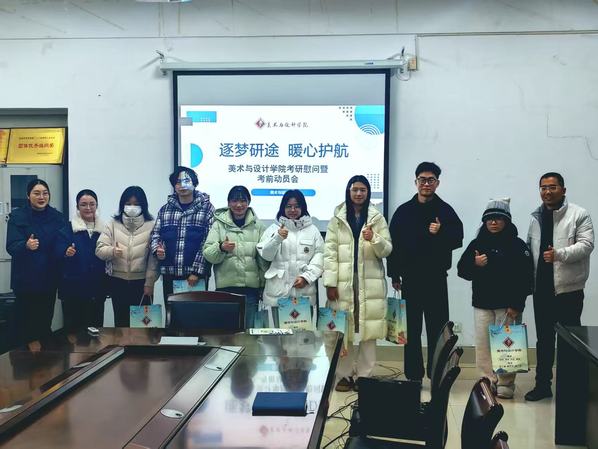 1217日下午,美术与设计学院于艺术楼219会议室召开逐梦研途 暖心护航考研慰问暨考前动员大会。学院党委副书记王寅、辅导员张琳、杨朝夕与全体考研学子齐聚一堂,共话备考初心,共绘逐梦蓝图。