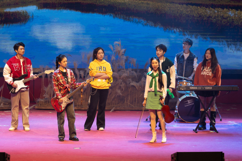该剧曾获盐城市精神文明建设五个一工程奖,时隔五年后经师生重新创排再登校园舞台,经过时光的沉淀让剧目所承载的文化内涵更加厚重,校园经典在传承中焕发出新的生机。剧目是以盐城黄海湿地为背景,围绕高校乐队成员程曦救助丹顶鹤“曦曦”的经历展开,展现了人与自然和谐共生的美好画卷。从“救鹤”到“卖鹤”,从“恋鹤”到“护鹤”,扣人心弦的情节主线背后,是对人性的深刻叩问,更是对生态文明理念的生动诠释。该剧深情回述了中国首位环保烈士徐秀娟的英雄事迹。演出现场,观众仿佛被带入盐城湿地珍禽国家级自然保护区,那份守护自然的赤诚在歌声与对白中直抵人心,赢得全场阵阵喝彩和热烈掌声。演出过程中,社会主义核心价值观贯穿始终,既彰显了当代中国精神,也为青年学子上了一堂生动的生态教育课。