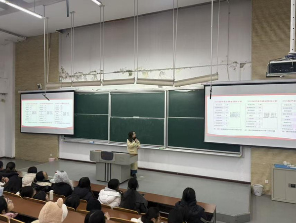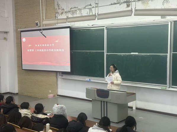 会上,学院就业工作辅导员通过翔实的数据图表,系统分析了学院2023-2025届毕业生考研、考编、考公等方面的核心指标与动态趋势。已成功考取南通市中学教师编制的2026届学生张慧璟,以“方法论解码与实战经验传承”为主题进行分享。她围绕笔试准备与面试提升两大模块,详细介绍了如何构建学科知识框架、高效进行真题实战与全真模拟复盘,并深度拆解了结构化面试的应答逻辑与技巧。