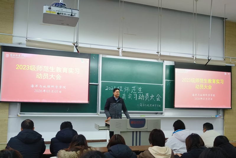 3月5日下午,海洋与地理科学学院召开2023级师范生教育实习动员大会。学院党委副书记、院长李传武,党委副书记吴恒仲以及2023级地理科学(师范)专业全体学生参会。副院长朱天明主持会议。
