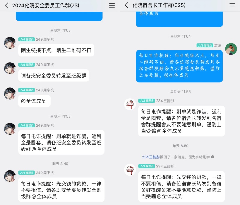 线上宣传同步发力,学院建立常态化提醒机制,每日在宿舍长群、安全委员群、楼层长群等精准推送反诈预警信息、典型案例与防范提示,实现反诈宣传无死角、全覆盖,努力将反诈知识传递到每一间宿舍、每一位同学,营造“人人懂反诈、时时防诈骗”的良好氛围。