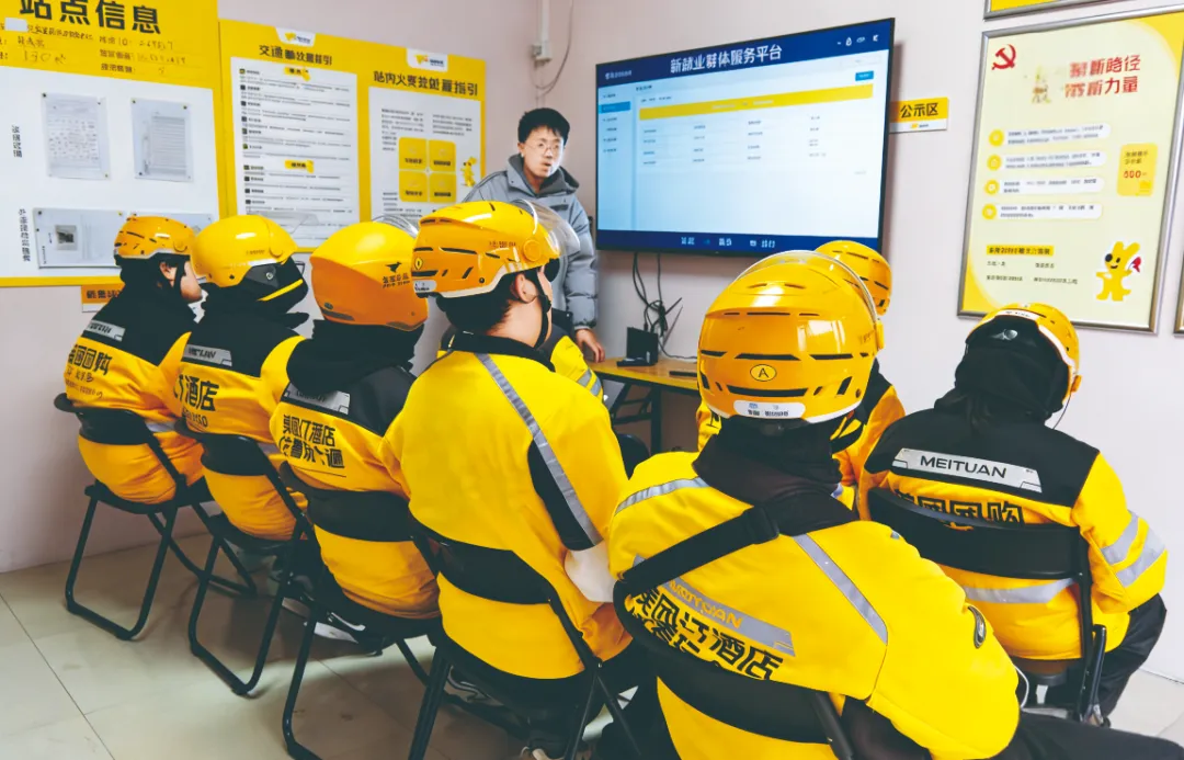 网约配送员集中学习“暖新盐城”平台人民建议征集功能操作方法。盐城市委社会工作部供图