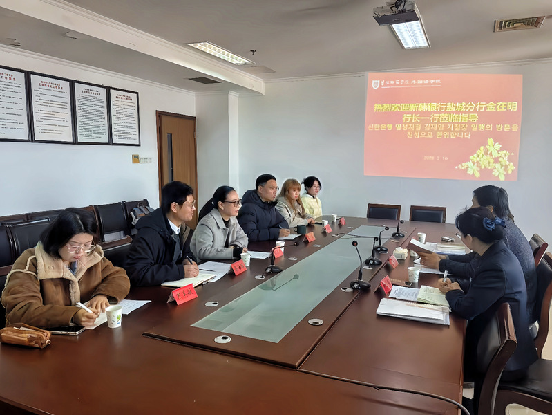 3月10日下午,外国语学院党委书记张宾州、党委副书记宋传盛、朝鲜语系主任梁海胜,热情接待了新韩银行盐城分行行长金在明、副总经理辛丽花、营业主管柏莹莹一行,双方围绕校企合作相关事宜开展深入交流座谈。
