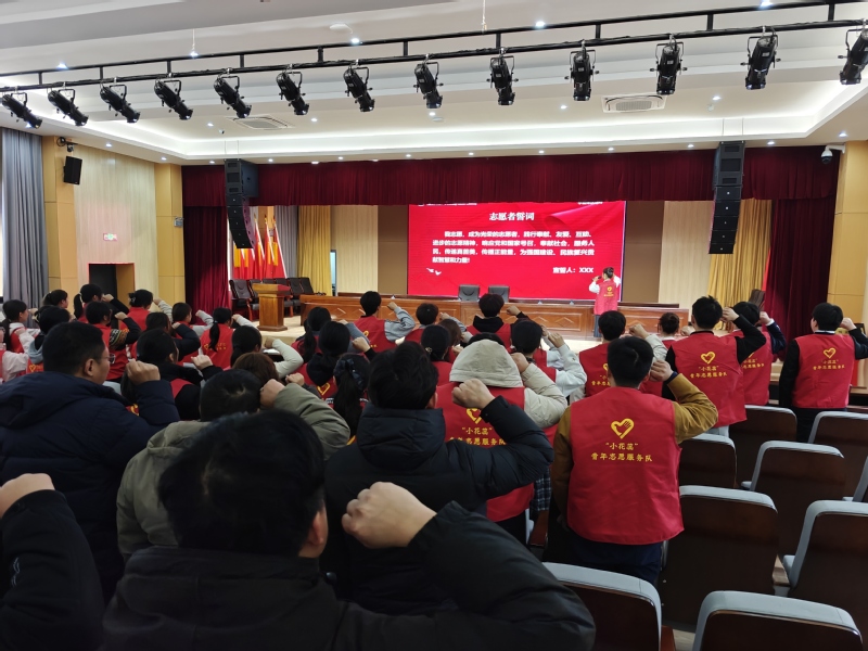 在思想动员的基础上,校地双方进一步通过机制建设推动合作走深走实。便仓镇党委副书记李楠与盐城师范学院团委副书记刘成现场签署了《校地共建志愿服务基地协议书》,并共同为志愿服务基地揭牌,标志着双方在资源共享与实践育人方面迈出关键一步。紧接着,便仓镇组织委员钱静文与盐城师范学院商学院党委副书记秦圣阳为新成立的“小花蕊”青年志愿服务队授旗。全体志愿者举起右拳集体宣誓,表达了投身基层服务的坚定决心。