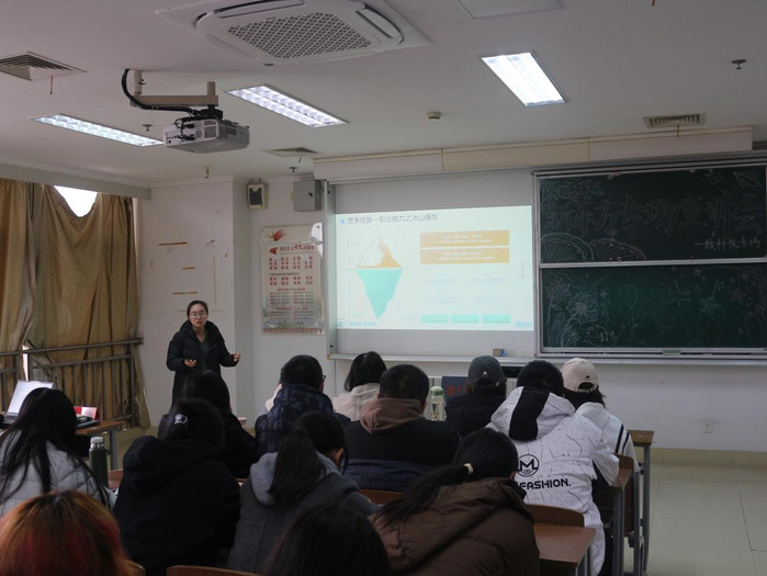 学院职业生涯规划导师、盐城市盐南高新区新东方文化艺术有限公司人力资源部总监陈露以“职业生涯规划与就业能力提升”为主题作专题分享。她从企业用人视角出发,结合长期招聘管理实践,深入分析了当前就业形势,系统解读了企业在招聘毕业生时所看重的核心素养。通过鲜活案例,帮助不同年级学生明晰成长路径,增强主动规划意识,为未来就业做好充分准备。公司人力资源部招聘负责人狄妍结合自身招聘管理与用人实践经验,详细介绍了新东方的发展历程、业务布局及人才培养理念,并发布了本次招聘的具体岗位及人才需求,进一步加深了同学们对企业的认识与了解,增强了求职信心。