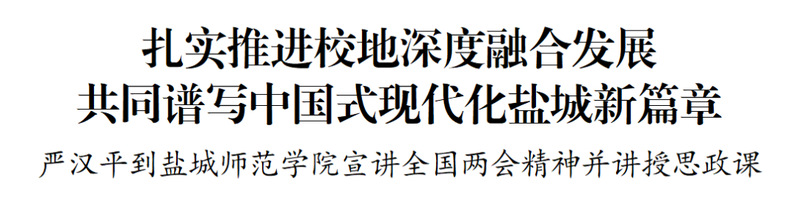 3月19日下午,市委副书记、市长严汉平到盐城师范学院宣讲全国两会精神并讲授思政课,与广大师生交流心得体会,希望大家准确理解把握习近平总书记重要讲话精神和全国两会精神,立足“十五五”发展新征程,进一步深入推进校地融合发展,共同谱写中国式现代化盐城新篇章。