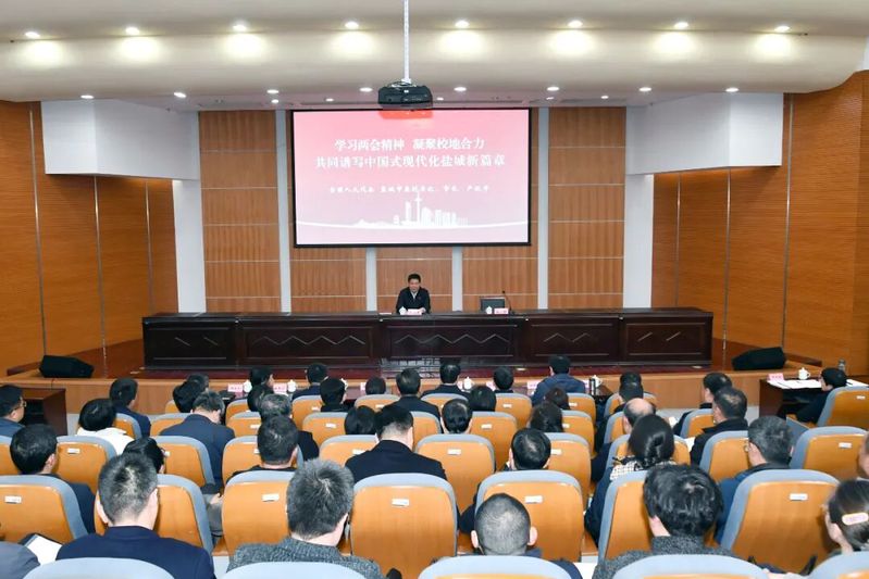 盐城师范学院新长校区图书馆学术报告厅内座无虚席。严汉平结合参会履职经历,向广大师生宣讲全国两会精神。他说,刚刚胜利闭幕的全国两会,对于动员和激励全党全国各族人民更加紧密地团结在以习近平同志为核心的党中央周围,向着强国建设、民族复兴的宏伟目标阔步前进,具有重大而深远意义。习近平总书记在参加江苏代表团审议时,围绕发展新质生产力走在前列,特别强调要一体推进教育科技人才发展。高校作为教育、科技、人才资源的重要聚合点,我们要深入学习领会习近平总书记重要讲话精神,切实增强创建高水平应用型大学的使命感紧迫感,推动形成教育、科技、人才一体推进的集聚效应、倍增效应,为地方经济社会高质量发展提供更加强有力的人才支撑和智力支持。