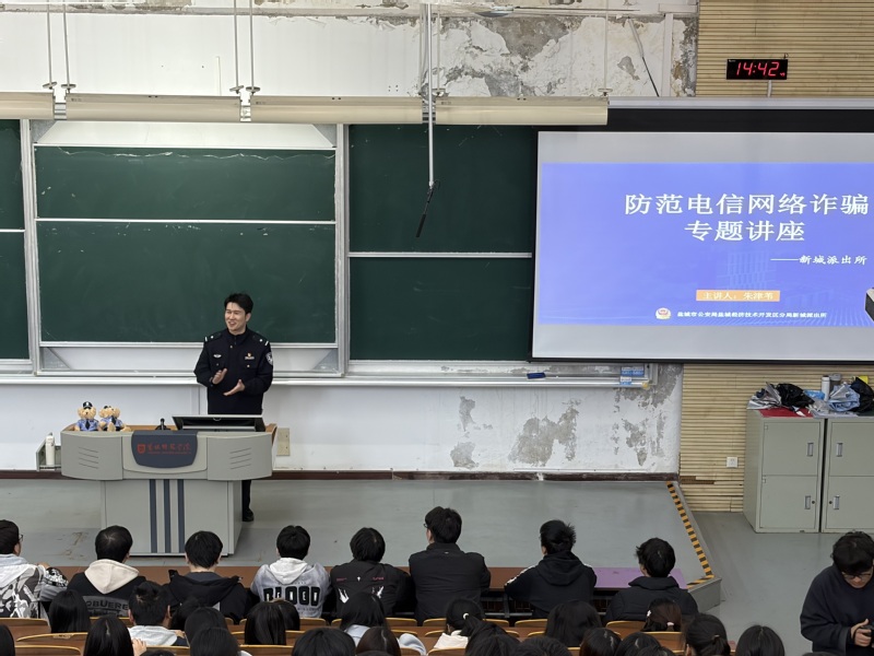 近日,化学与环境工程学院举办防范电信网络诈骗专题讲座,盐城市公安局盐城经济技术开发区分局新城派出所朱警官应邀主讲,200余名学生参与学习,共同筑牢校园安全防线。