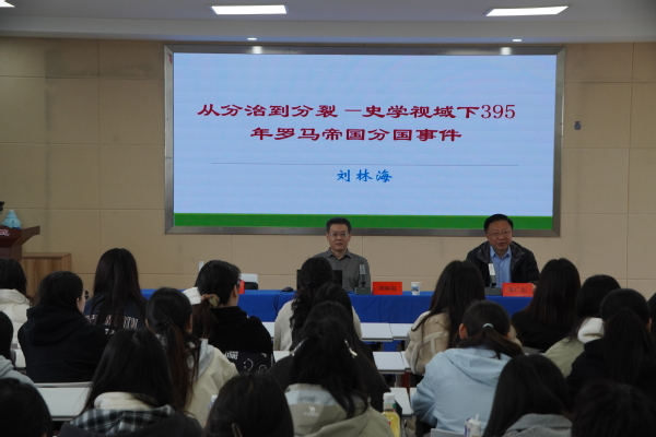 3月27日上午,学院特邀北京师范大学历史学院院长刘林海教授作“从分治到分裂:史学视域下395年罗马帝国分国事件”为主题的学术讲座,学院党委书记朱广东主持讲座,历史学专业部分师生参加学习。
