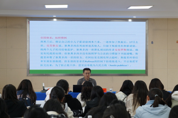 讲座中,刘林海以“395年罗马帝国分裂”这一传统观点为切入点,通过“分治”与“分裂”两个角度展开理性辨析。同时,刘林海提出几点思考,从“主动分治”到“被动分裂”的认知转变,是史家时代背景与现实需求的投射;“分裂说”与“分治说”各有视角,需辩证看待;西方相关叙事也影响着国人对异域历史的认知,跨文化学习要警惕认知偏差、保持批判审慎。他指出,对历史的辩证探寻、对认知的理性辨析,正是文科独有的核心思维能力,也让文科在数字化的今天,成为最不容易被替代的存在。在互动问答环节,现场同学们踊跃发言、积极提问,刘林海教授逐一耐心细致解答。