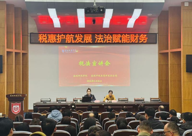 3月26 日下午,计划财务处联合盐城经济开发区税务局举办税法专题宣讲会。各二级学院、部门负责人,科研平台负责人,教职工代表共100余人参加活动。计财处副处长柏云燕主持宣讲会。